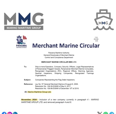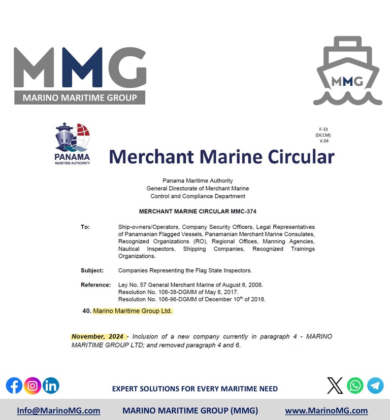 We are proud to announce a significant milestone in the journey of Marino Maritime Group (MMG). The company has been officially recognized by the Panama Maritime Authority (PMA) to represent Flag State Inspectors, as referenced in the Merchant Marine Circular MMC-374.